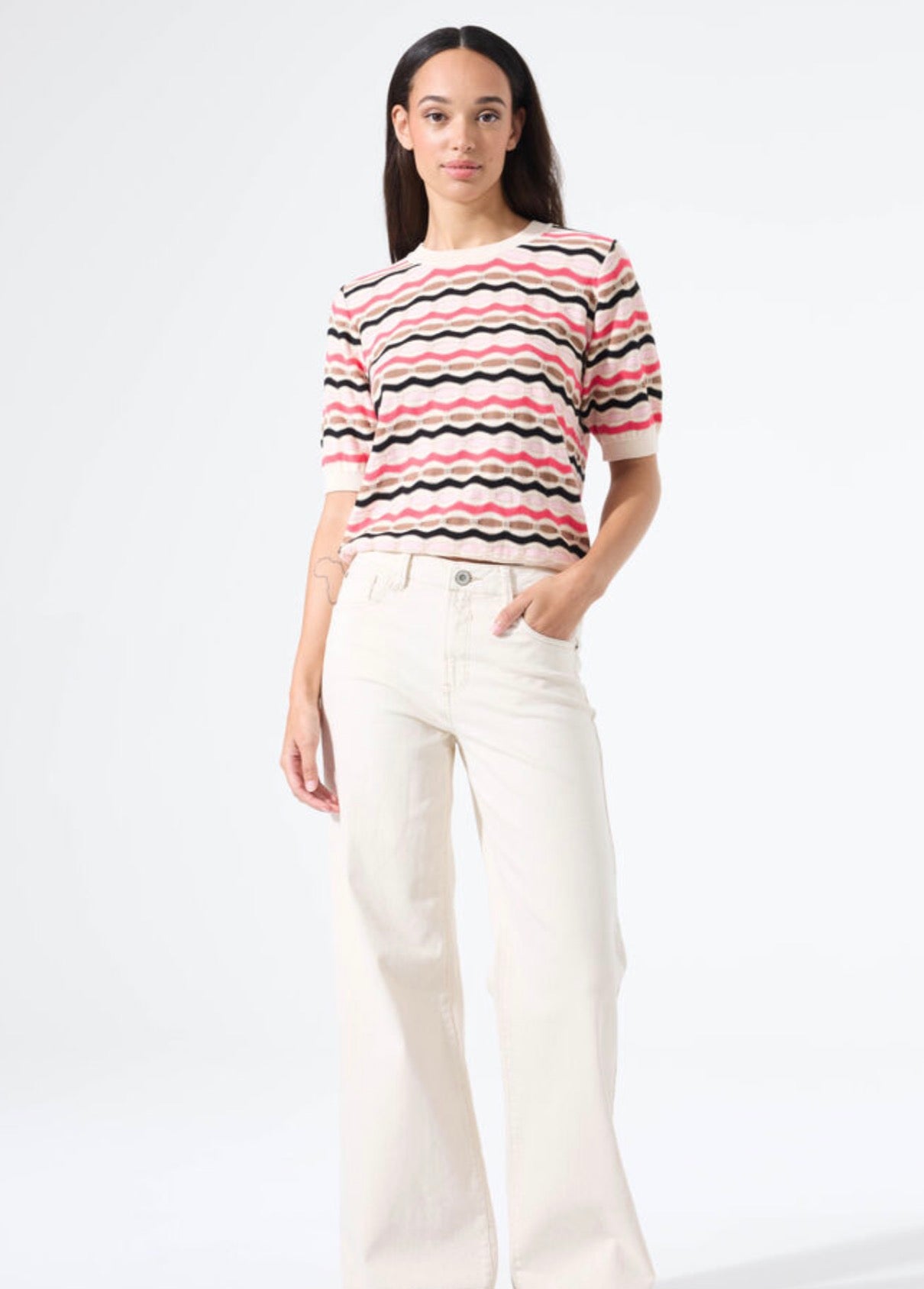 Sweater with a striking pattern. This sweater features a round neckline, short sleeves, and a regular fit. This item is made of 90% cotton and 10% metallic yarn, which gives it a comfortable and playful appearance.