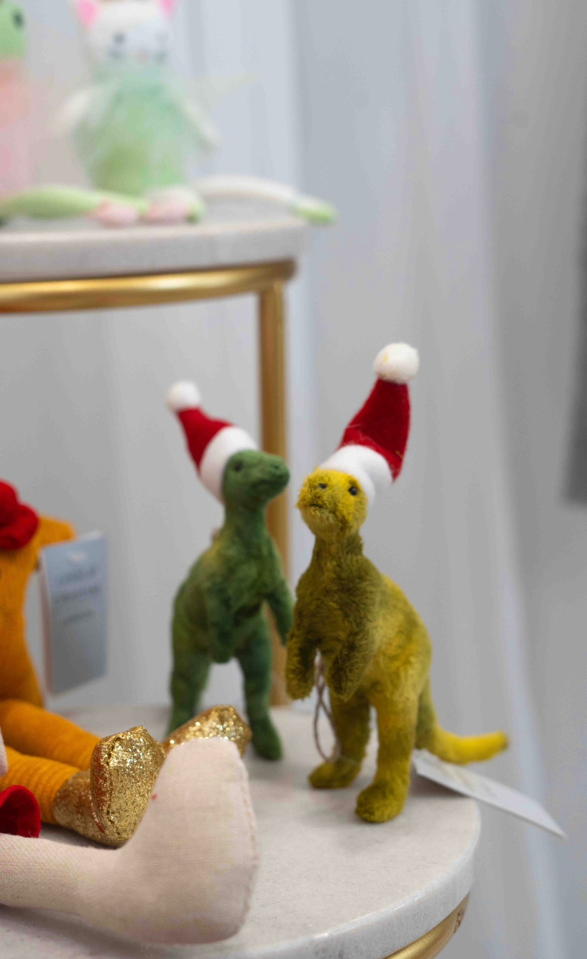 Adorable dinosaur Christmas tree decorations. Each dinosaur is made of soft, fuzzy material — one in green and the other in a lighter yellow-green shade. They’re both wearing festive red and white Santa hats, adding a cheerful holiday touch to their playful look. The dinosaurs stand upright with a friendly, whimsical appearance, making them perfect for adding a fun and quirky charm to a Christmas tree or holiday display.