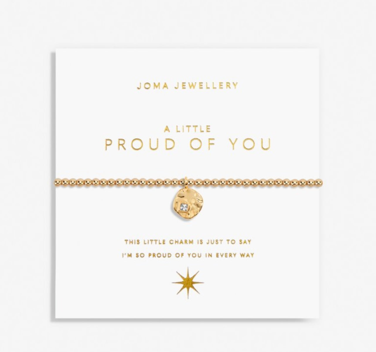 Our iconic A Little Collection has had a golden makeover! This 'Proud Of You' Bracelet will create the most memorable gifting moment, boasting a stretch-bead style that ensures a comfortable fit on any wrist. The bracelet is adorned with a beautiful gold-plated charm, which is wrapped around one of our stylised cards and framed by a heartfelt poem. A must-have for all our gold-loving girls!