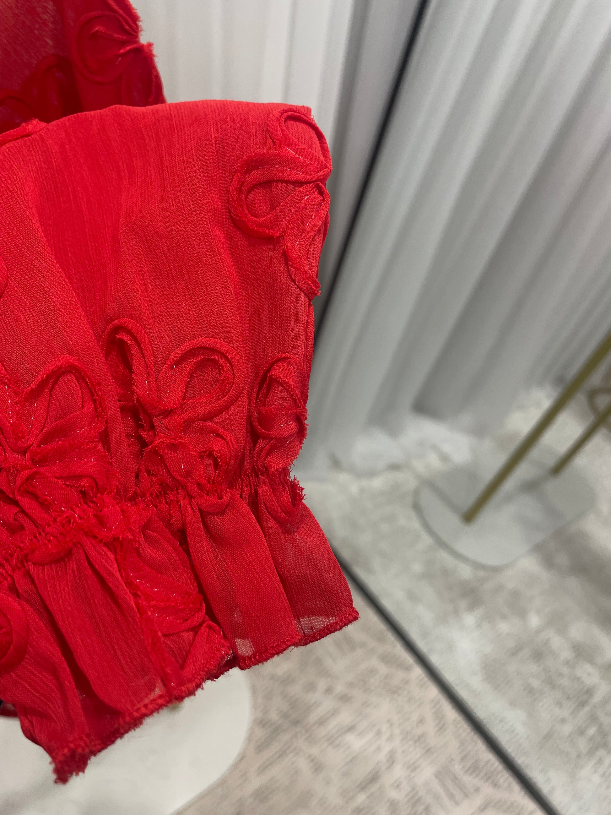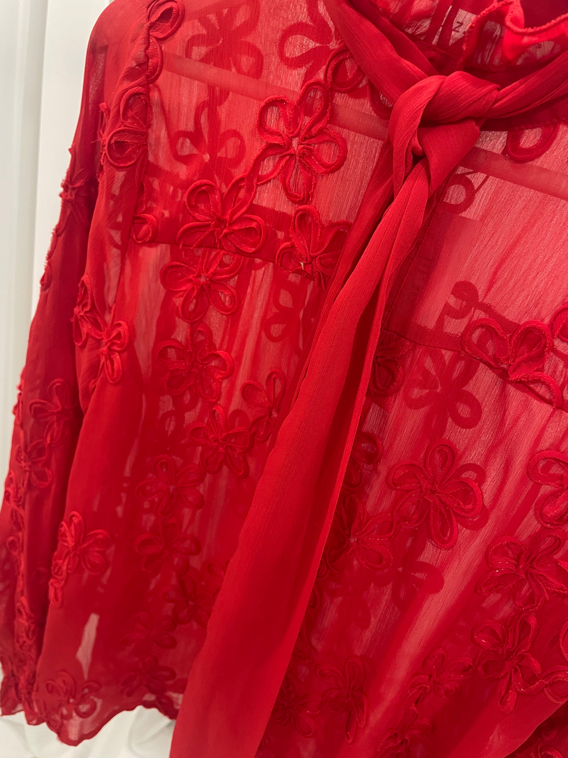 This blouse features a straight fit, sheer textured finish, elegant long sleeves with elastic ruffled cuffs, and a statement pussy-bow tie at the high neck. Discreet floral appliqué detail enriches the modern silhouette.