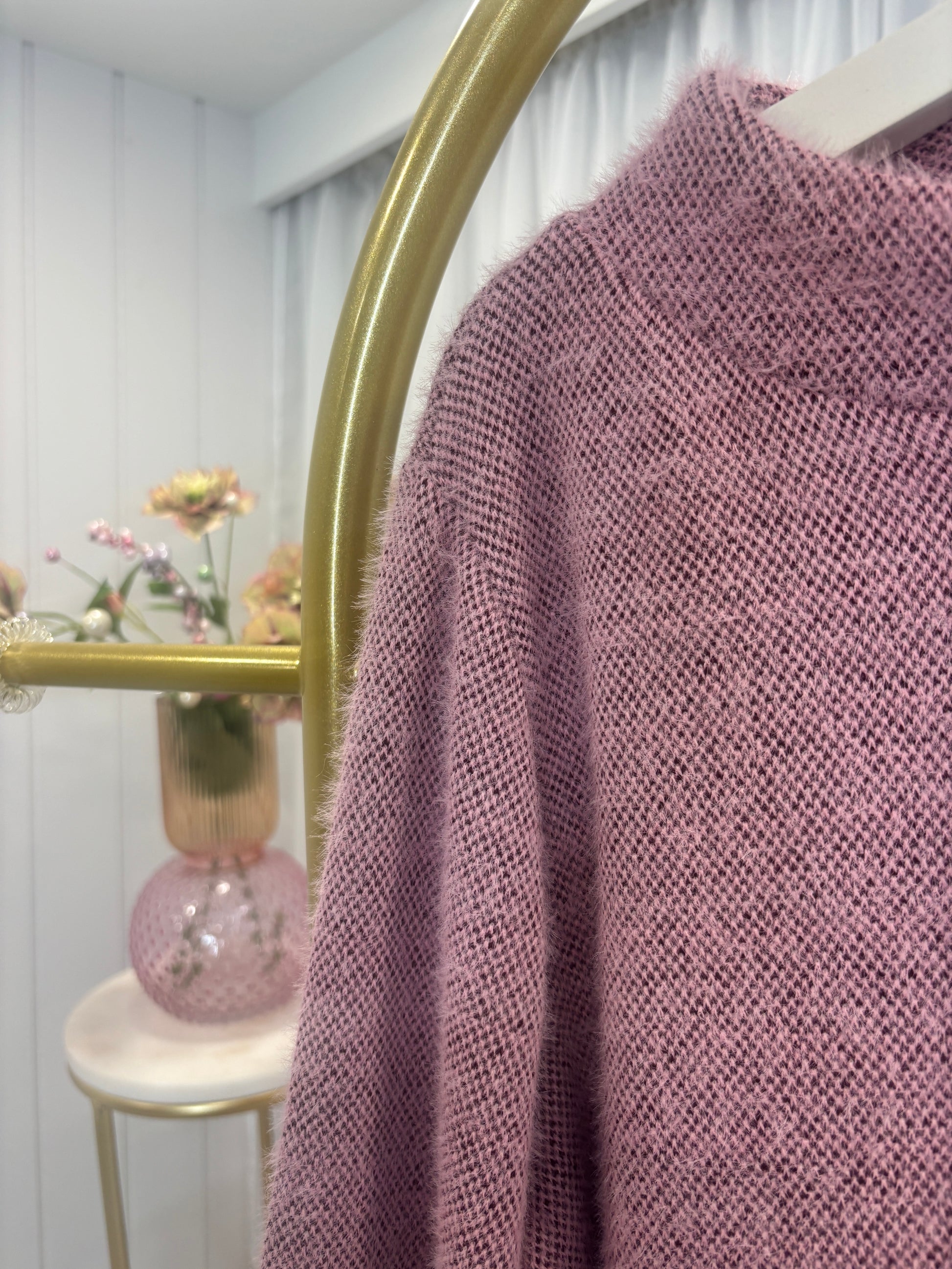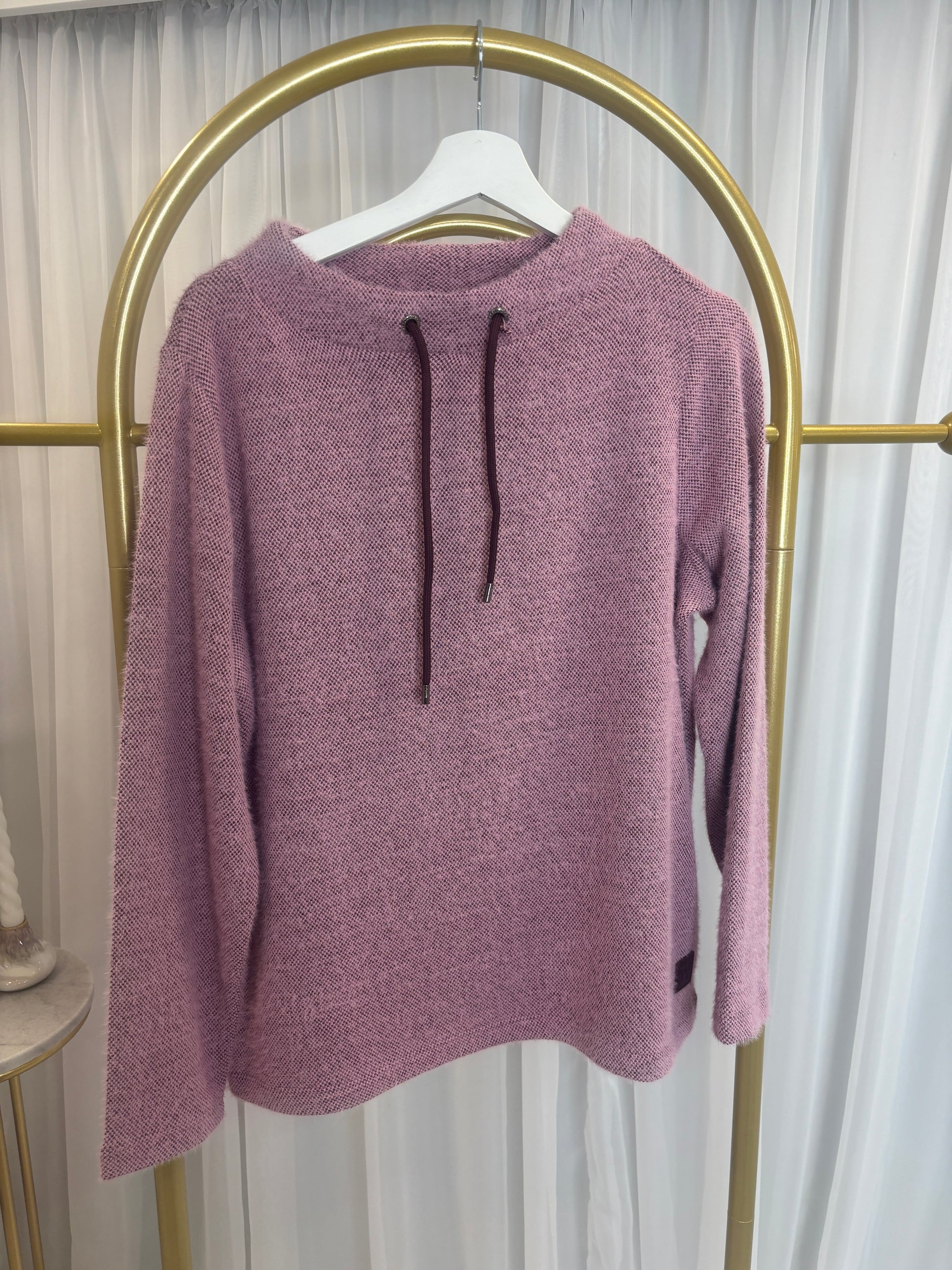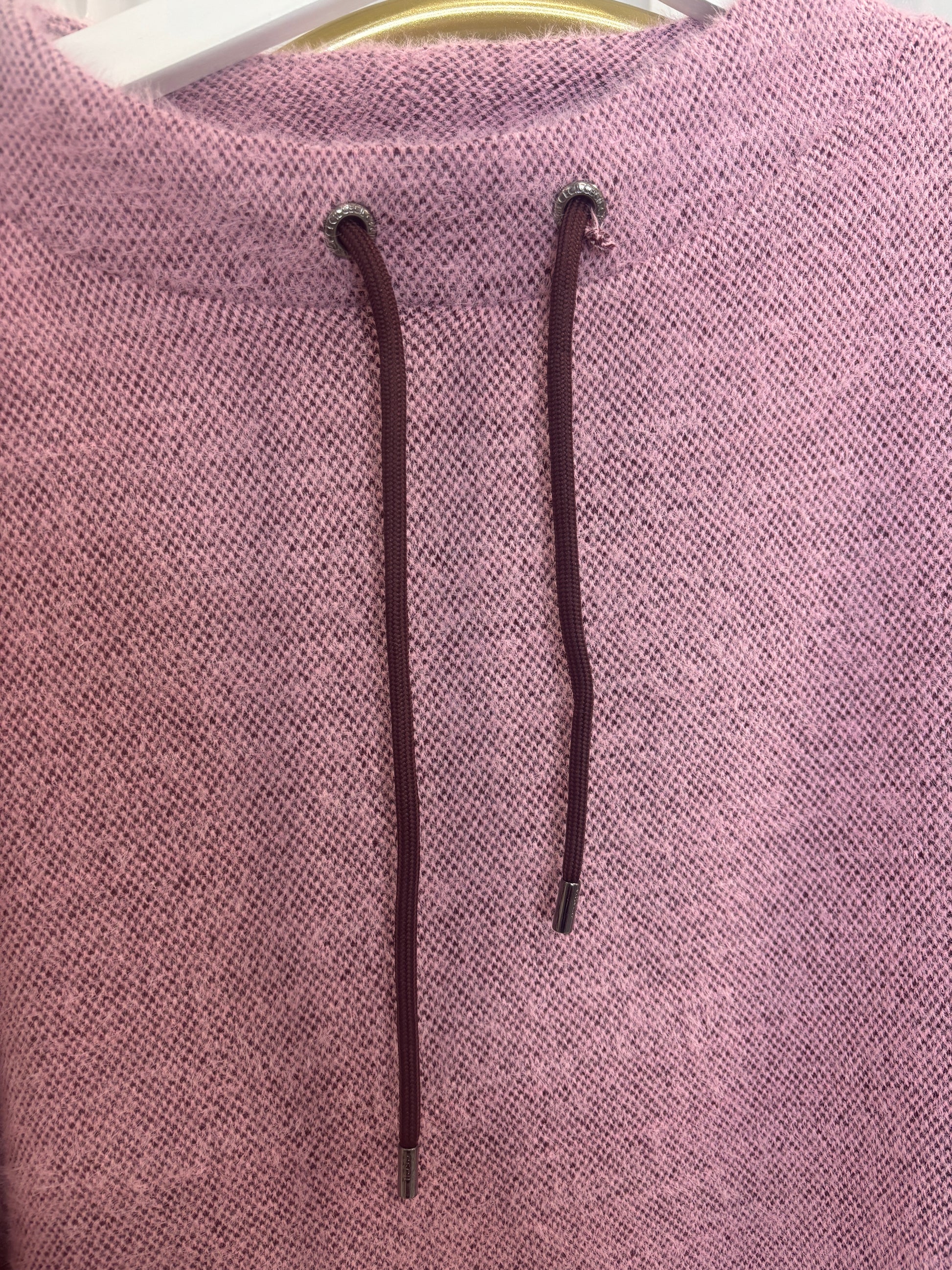 Pink feather yarn long sleeve top with adjustable draw stings around neck