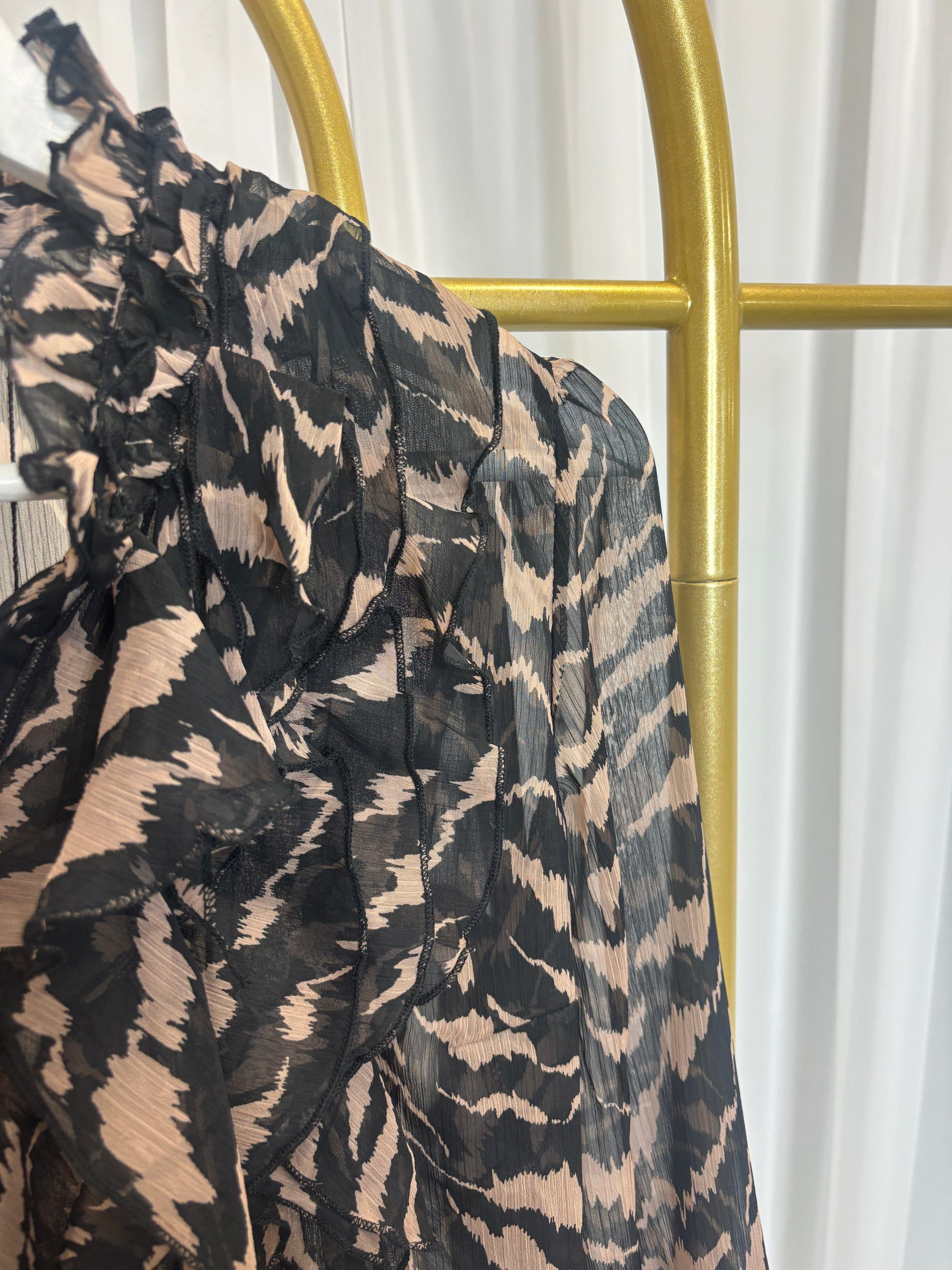 Blouse with sheer fabric and long sleeves. Features a high ruffled neckline and decorative layered ruffles down the front. Made from lightweight woven material with a regular fit. The model is 179 cm tall and is wearing a size S.