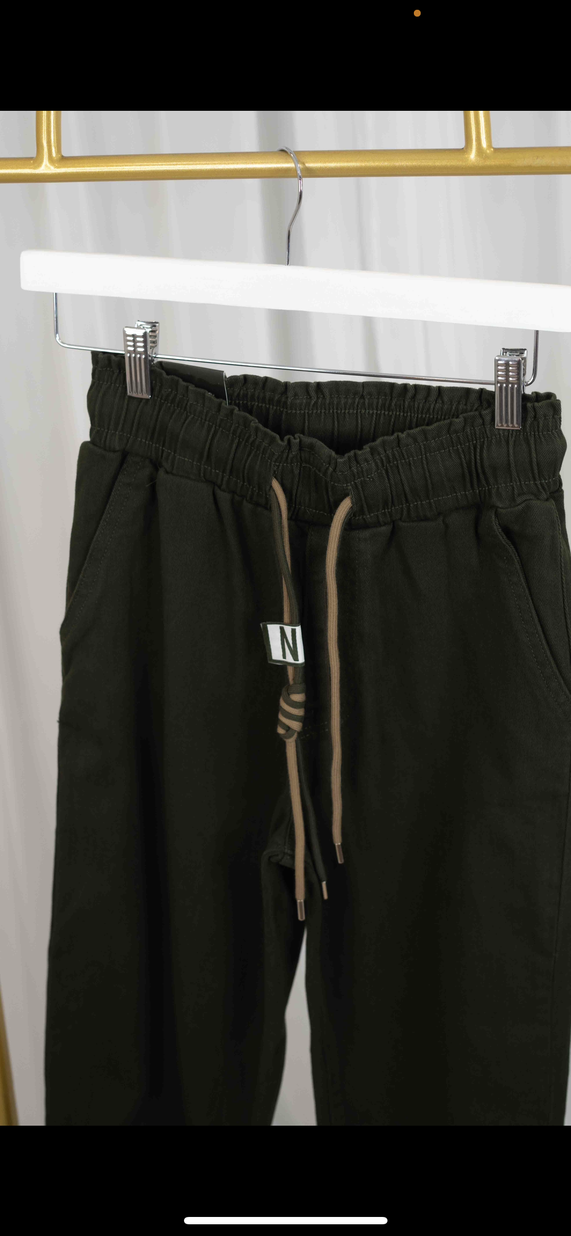 These are a pair of khaki elastic-waist jeans/jogger-style trousers designed for both comfort and style.
