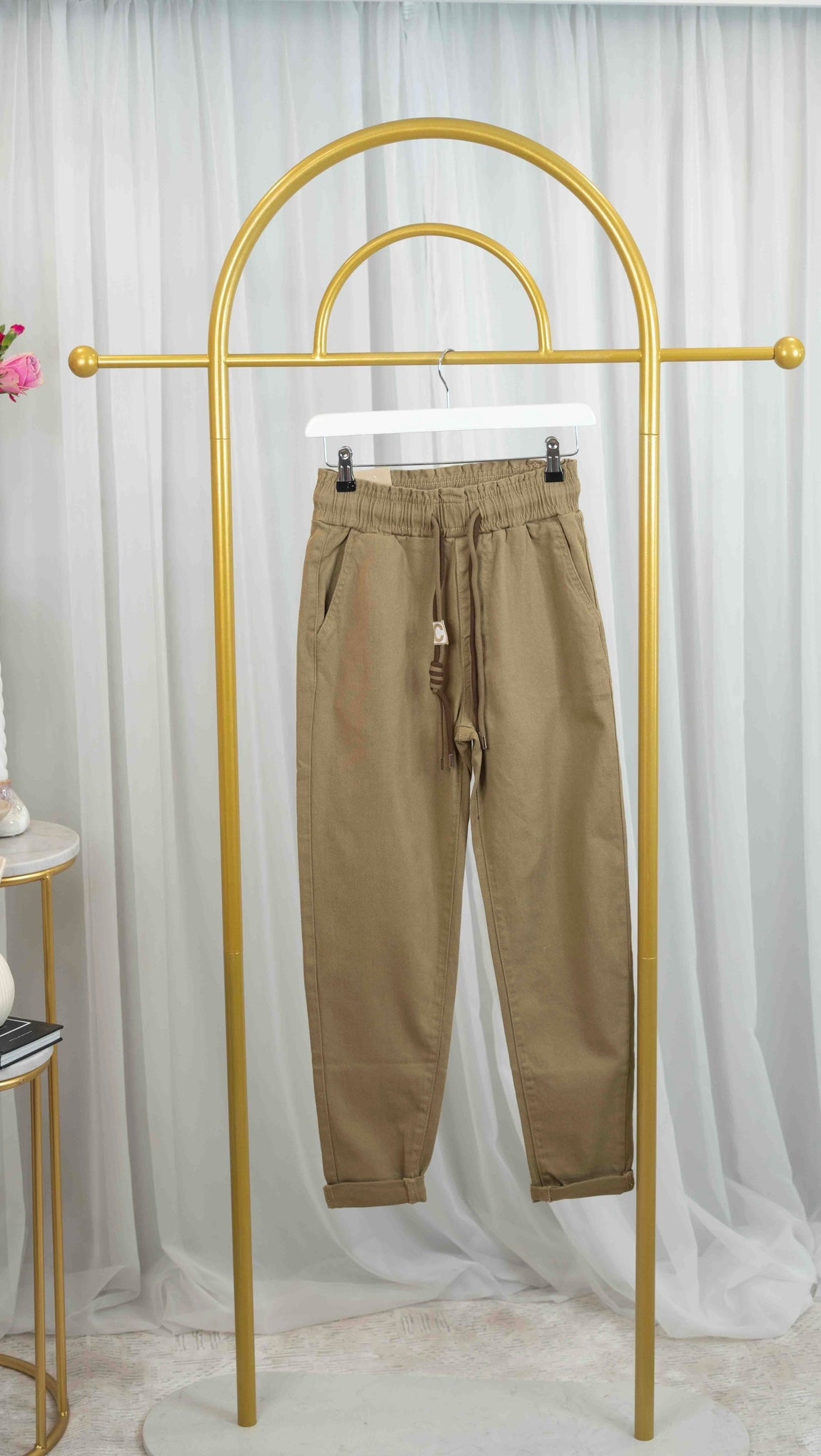 These are a pair of taupe jeans/jogger-style trousers designed for both comfort and style.