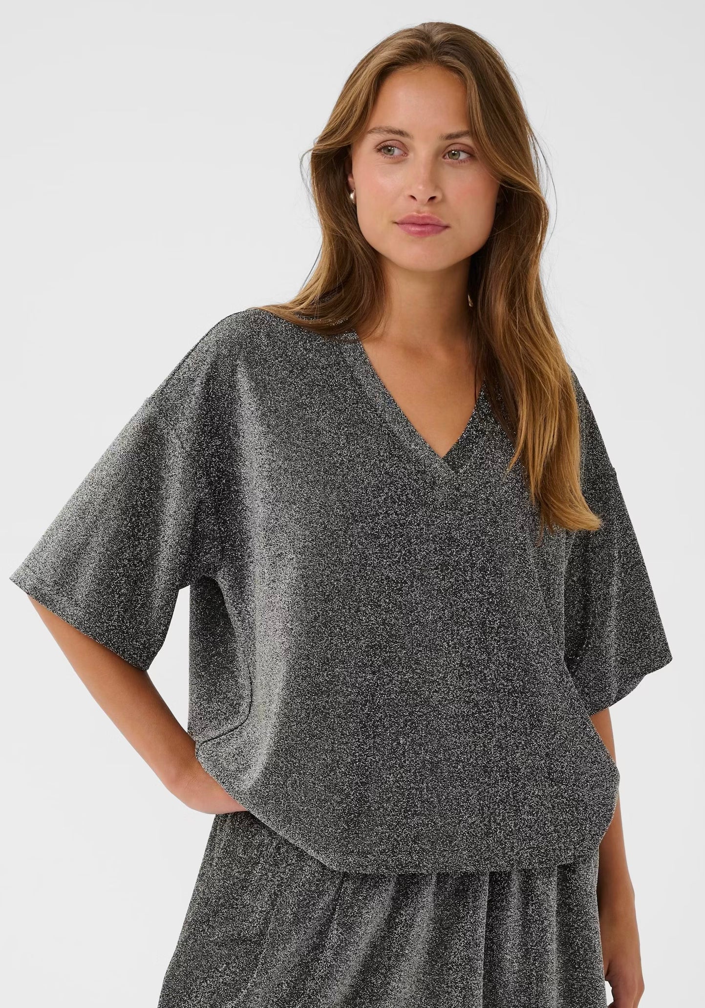 This women's top with V-neckline and relaxed silhouette offers a comfortable loose fit. Features wide short sleeves and a lightweight, shimmering fabric perfect for versatile day-to-night styling.