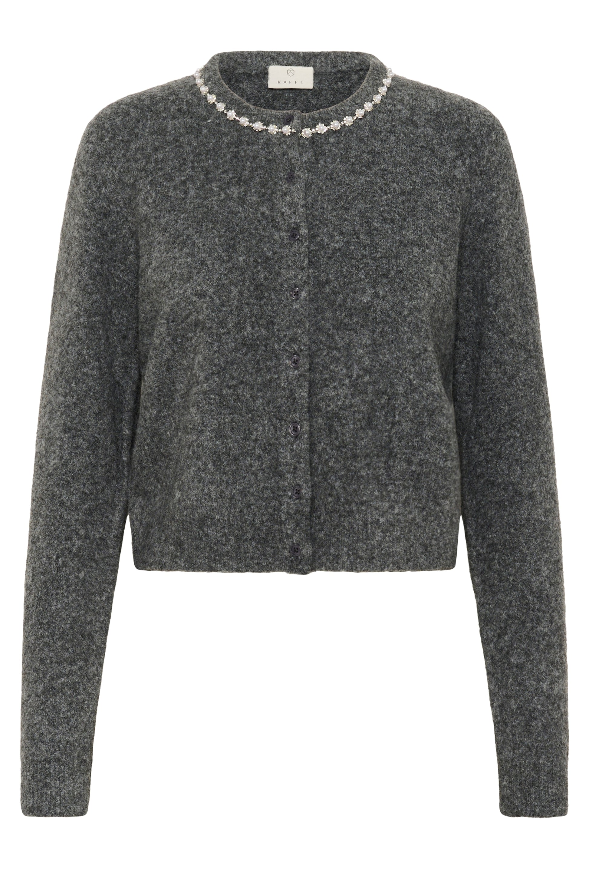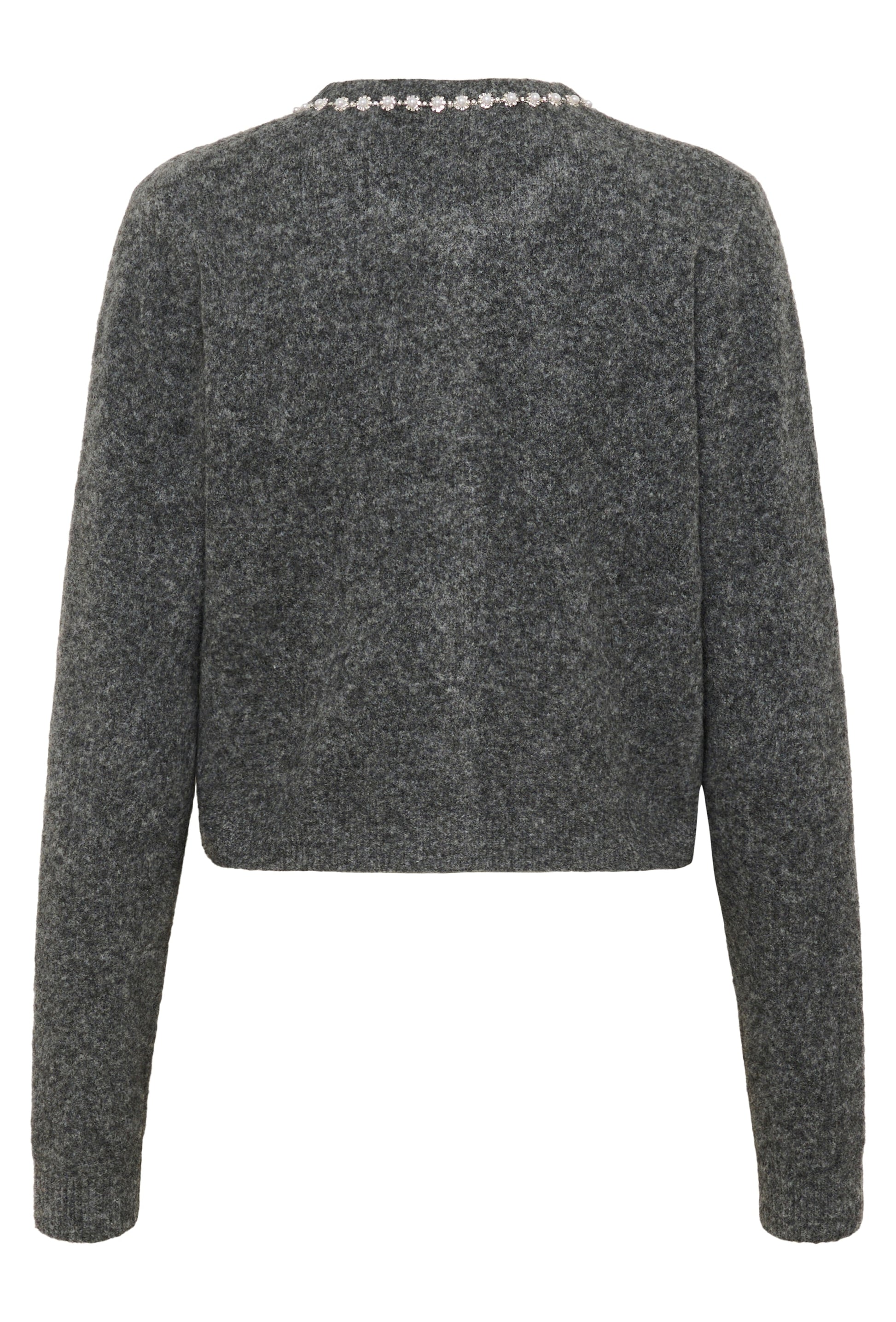 Soft cropped knit cardigan with long sleeves and round neckline, featuring delicate embellished trim. Comfortable straight fit for versatile styling options, ideal for both casual and sophisticated occasions.