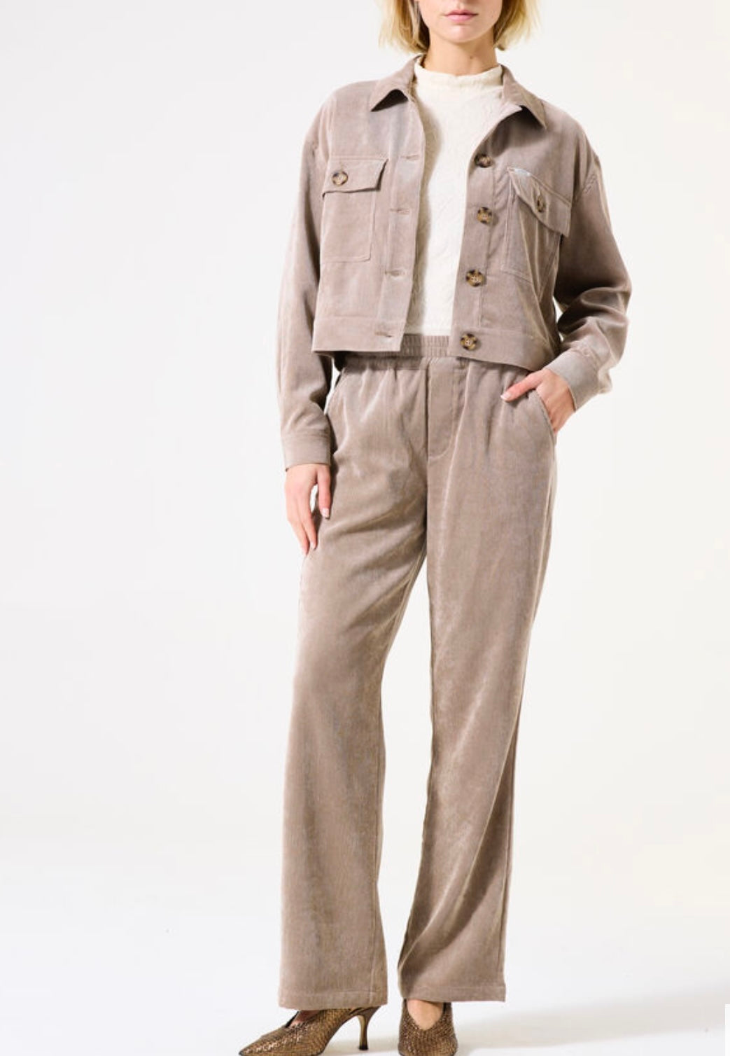 Stylish corduroy trousers with a high waist. These trousers feature an elasticated waist, front pockets and offer a comfortable wide fit.