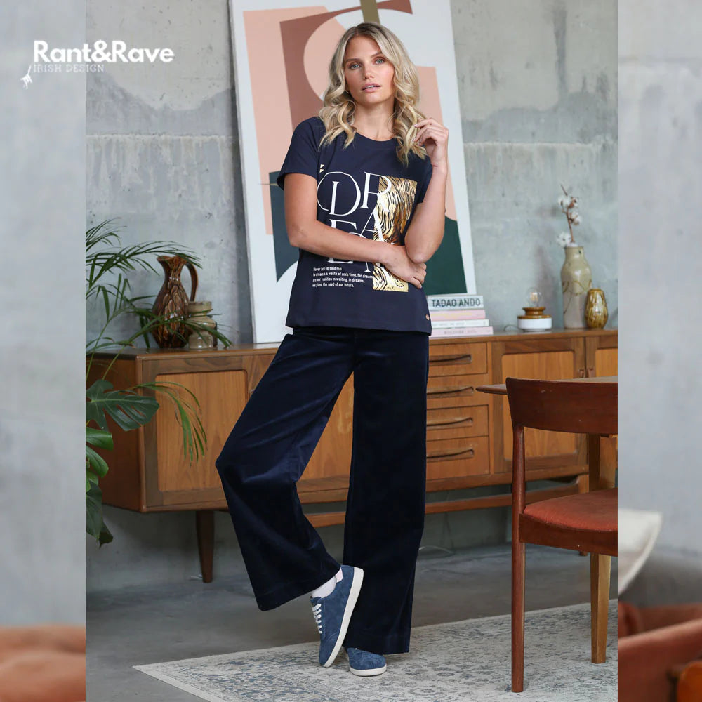 Rant and Rave Wanda Tee in Navy, featuring the inspiring word "Dream" emblazoned across the front. This short-sleeve t-shirt combines comfort and style, making it perfect for any occasion—whether you're lounging at home or out with friends. Crafted from soft, breathable fabric, it offers a relaxed fit that flatters every body type. Embrace your aspirations and make a statement with this versatile tee that pairs effortlessly with jeans, shorts, or skirts.