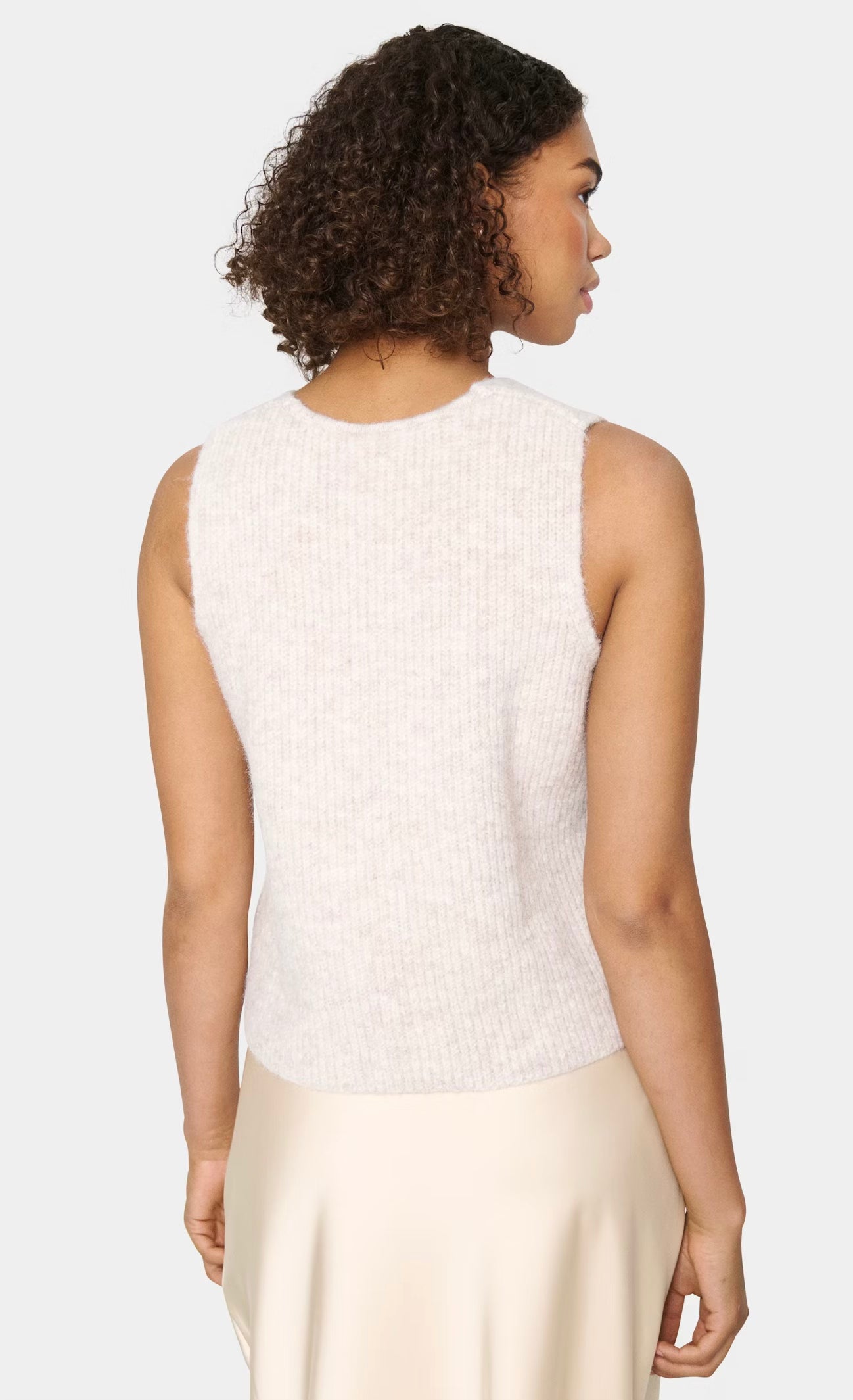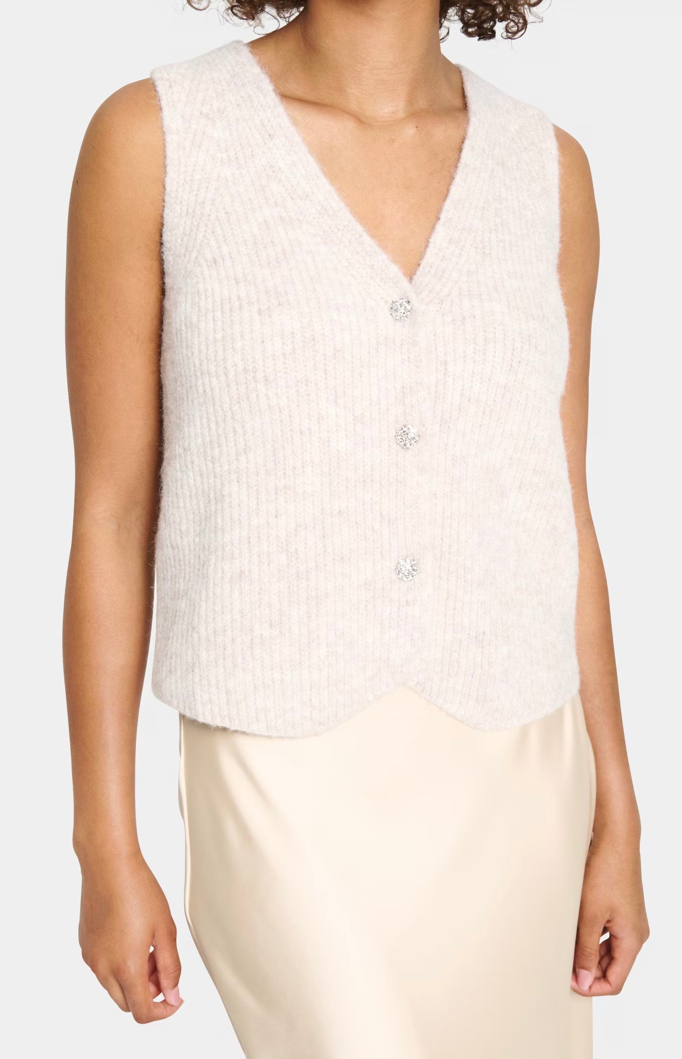 A beige knitted vest with ribbed texture and deep V-neckline. Designed with front button closure and a soft, slightly cropped fit. The model is 179 cm tall and is wearing a size S.